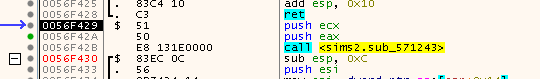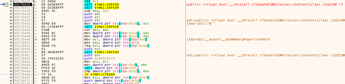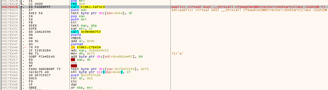 At first it doesen’t look too weird. Just some CALL, followed by a few instructions, nothing special. But a few instructions down the line some weird stuff starts to show up, also upon closer inspections, the instructions don’t make too much sense. Moreover, this function at 0x00C7E62E is a named export virtual bool __thiscall cTSCommonCOMDirector::OnStart(class cIGZCOM *) (demangled by x64dbg), so we would expect some more meaningful code here. Looks like there is probably some trickery going on.