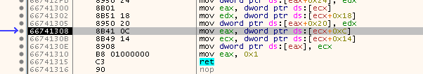 Why are there all these Calls? They have no parameters and they also seem to return nothing. If you step into them, you will find a very familar setup: Two stubs in code caves and then the famous setup code (PUSHFD, PUSHAD, …). So, again. There is clearly some trickery going on. But what is it this time? Go ahead, try the “Breakpoint on PUSHFD” method again and see where you land. You should land at seemingly random places in the game code. Sometimes you just land on the next instruction. Sometimes you land in a completely different function.