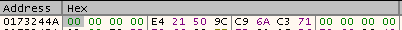 The function that follows shortly after parses the first 12 bytes as 3 DWORDs (0x00000000, 0x9C5021E4, 0x71C36AC9) and stores them in an array. Directly after that another function is called which definitely deserves our attention!