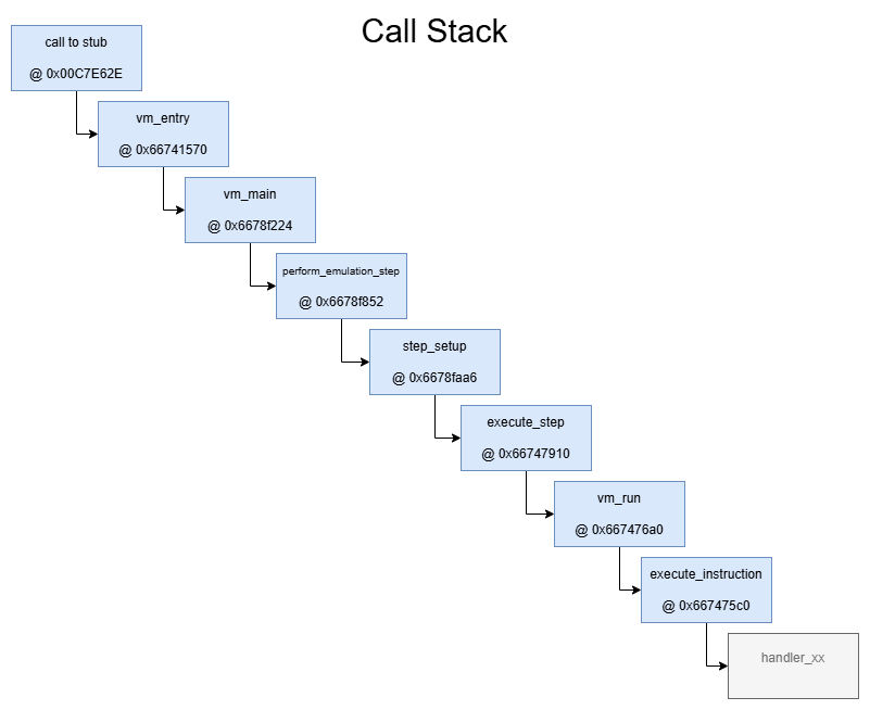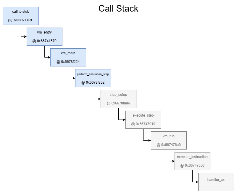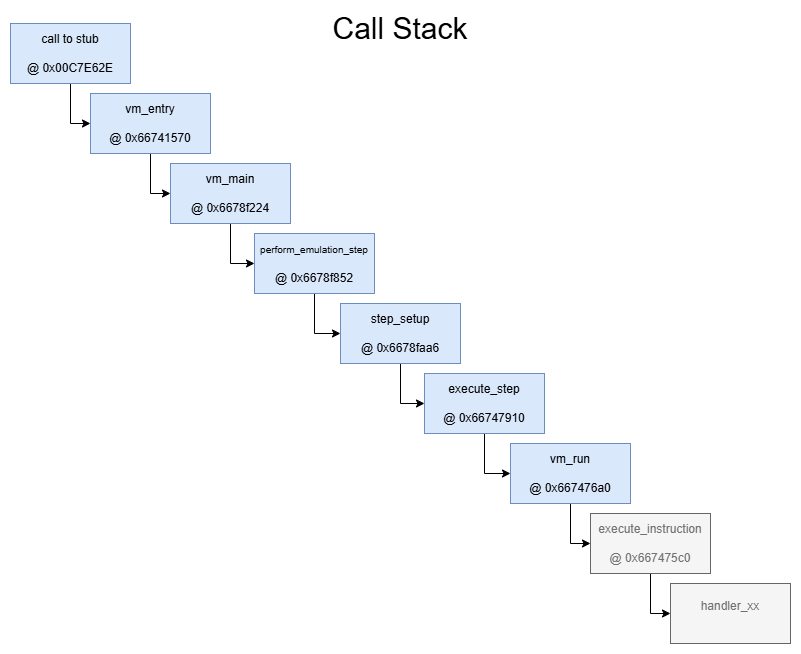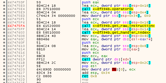 And finally in the fourth and last call, the corresponding VM-handler is called. In theory there can be up to 128 handlers, but in reality there are only 28.