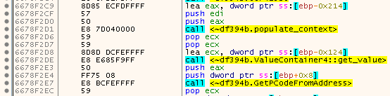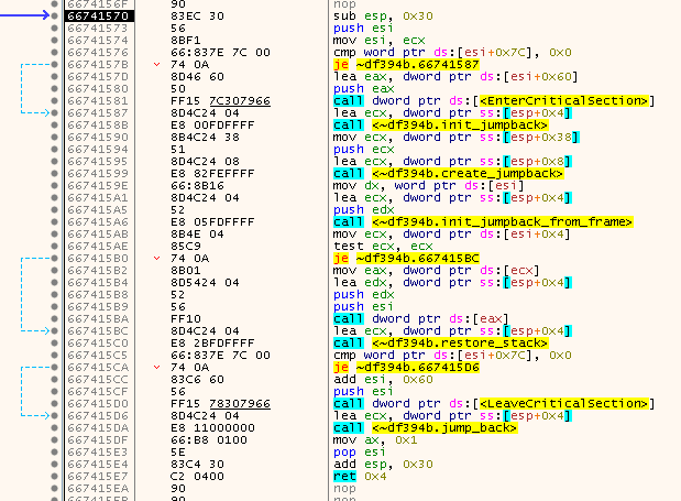 The hardcoded calls are somewhat simple to reverse. They retrieve the ‘context’ that was pushed onto the stack via PUSHFD and PUSHAD and also a jumppad (trampoline) is installed in order to jump back to any arbitrary location after the SafeDisc magic is over.