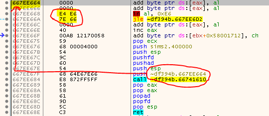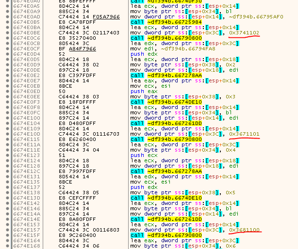 In order to get an idea of what’s going on, let’s dig down the rabit hole one step at a time. Enter the call to 0x0056F509 - located at e.g. 0x00C7E62E, 0x0041290C, 0x004184DF, … - as seen at the beginning of the article and step into a few more times until you land in this function at 0x66741570: