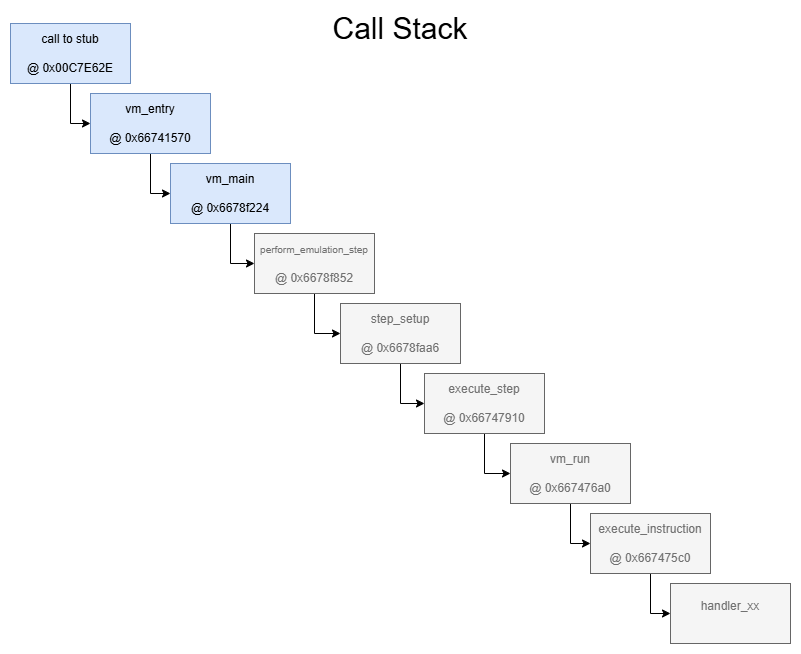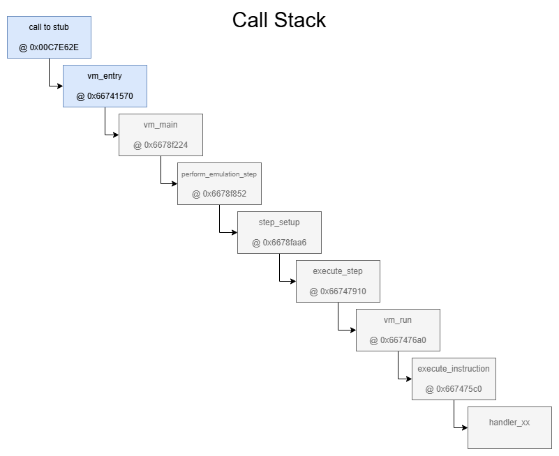 - The return address of the Call in the user code is used as a lookup to retrieve a single P-Code from a list of P-Code-Descriptors. But this P-Code is not directly executed by the VM, it’s rather parsed/interpreted by the static internal P-Code of the VM, hence it’s more like an ‘Initialization Vector’ (IV).