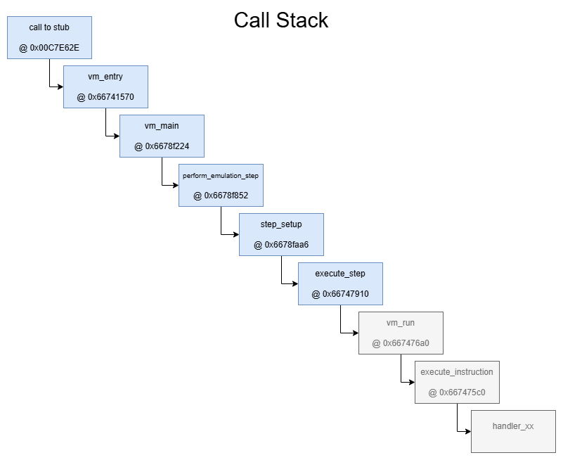 The next routine we need to explore is the one at 0x6678F852 which I named perform_emulation_step, don’t get overwhelmed by all the buzzing that’s going on in there. After renaming a lot of stuff I’m quite sure that this routine actually does not much meaningfull on it’s own, just step over the mess until you land on the routine starting at 0x6678FAA6 (step_setup).