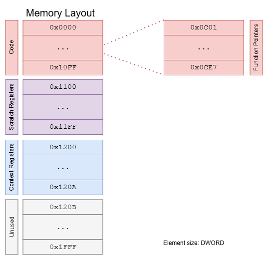 So 0x2000 ‘memory cells’ of size DWORD. Note that the scratch registers are addressed relative in the code, so one needs to add 0x1100 to get to the real address in memory, everything else is addressed absolute. Most of the memory space is unused, for example, the actual code has just a length of 458 (0x1CA) DWORDs.
