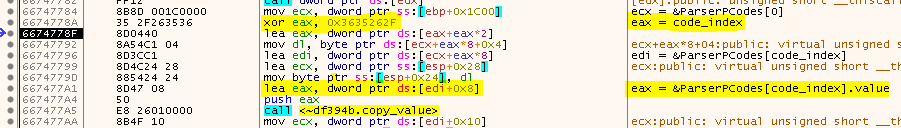 ParserPCodes[n] itself is one of the ValueContainers we talked about earlier (size: 0x18) and the value member is located at offset 8.