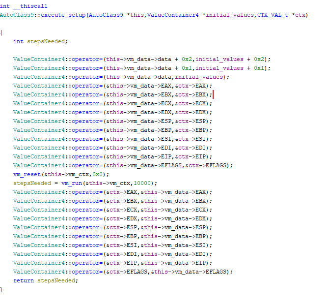 So the three parsed values from the PCODE_DESCRIPTOR_t (0x00000000, 0x9C5021E4, 0x71C36AC9) and all the registers (hence the context) are copied over, then the VM is reset (the internal instruction pointer is reset to zero), and finally what looks like the inner VM run-function is reached - Yay!