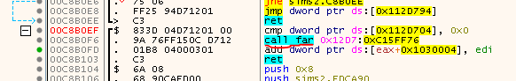 Let’s do that one more time. For the second call at 0x00C7E633 (see image above) we get the following IVs: 0x00000000, 0x634968BF, 0x71C160C9. That results in an opcode of 2 (CALL), an operandA of 10 (EIP), an operandB of 8 (IMM) and IMM has a value of 0xFFE90934. So we get:
