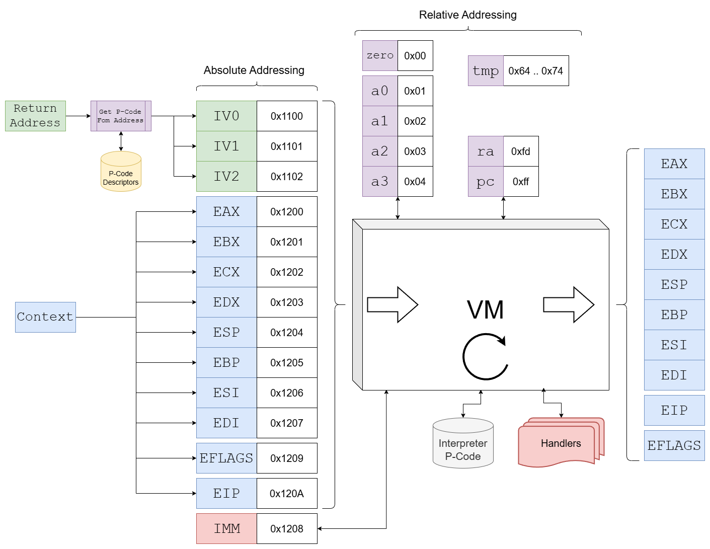 - The IVs and the original registers get mapped into the VM_MEMORY at the given offsets/addresses. One fake-register is added that is used for immediate values, it gets filled by the VM.