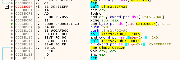 The underlying struct in which the Nanomite data is stored did not change much since previous versions of SafeDisc, so I could identify it easily. It can hold up to 8 bytes, but since we need 12 bytes for the IV, the IV1 part was hardcoded to be always zero. The recovered IV is (0x00000000, 0x9CA0618D, 0x71C760C9) which results in an OpCode of 4 (JNE/JNZ), operandA is 10 (EIP) and operandB is 8 (IMM) and the Immediate value is 6. So a ‘JNE +6’ - exactly as we expected ;)