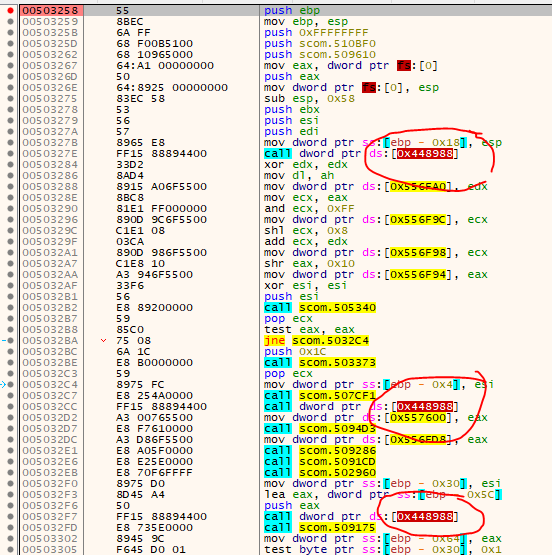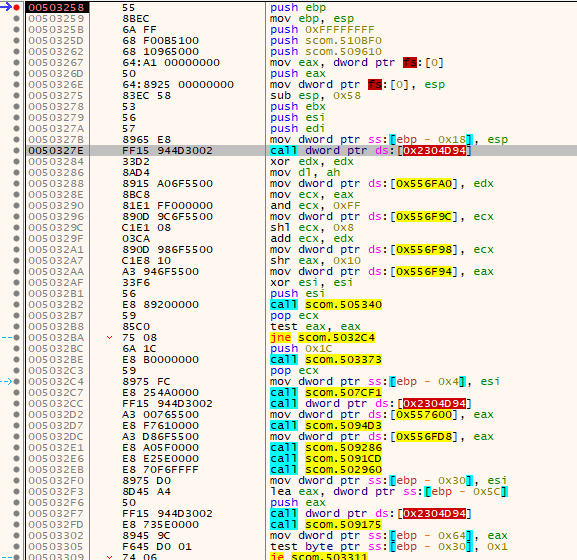 So I placed a hardware breakpoint on the address of the first call (0x503280) to see where this gets overwritten and landed here: