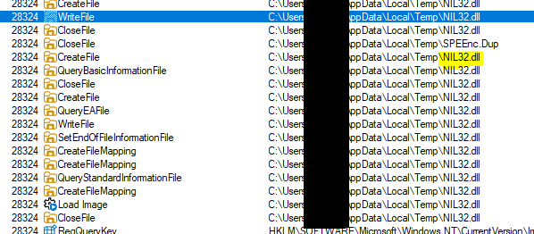 But for a fast start, let’s keep it simple and as always, start up x64dbg and Procmon and have a look around. We see that a temporary file called NIL32.dll is created and later this file is loaded as a DLL (LoadLibrary).