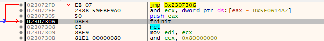 I then proceeded to single-step through the code and write down library CALLs. These calls give you the option to fast-forward a bit. So instead of breaking on FreeLibrary, you can - for example - break on LocalAlloc or LoadLibraryA which are called later down the road. I figured out that the last calls go to a bunch of CloseHandle and then a LocalFree. After that, you can single-step a few times and you land on this bit: